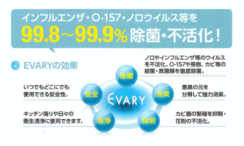 商品名:抗ウィルス性除菌水EVARY ・塩素濃度50ppm、ph6.5で安定した状態の優れた 除菌、ウィルス、不活化効果のある除菌水です。